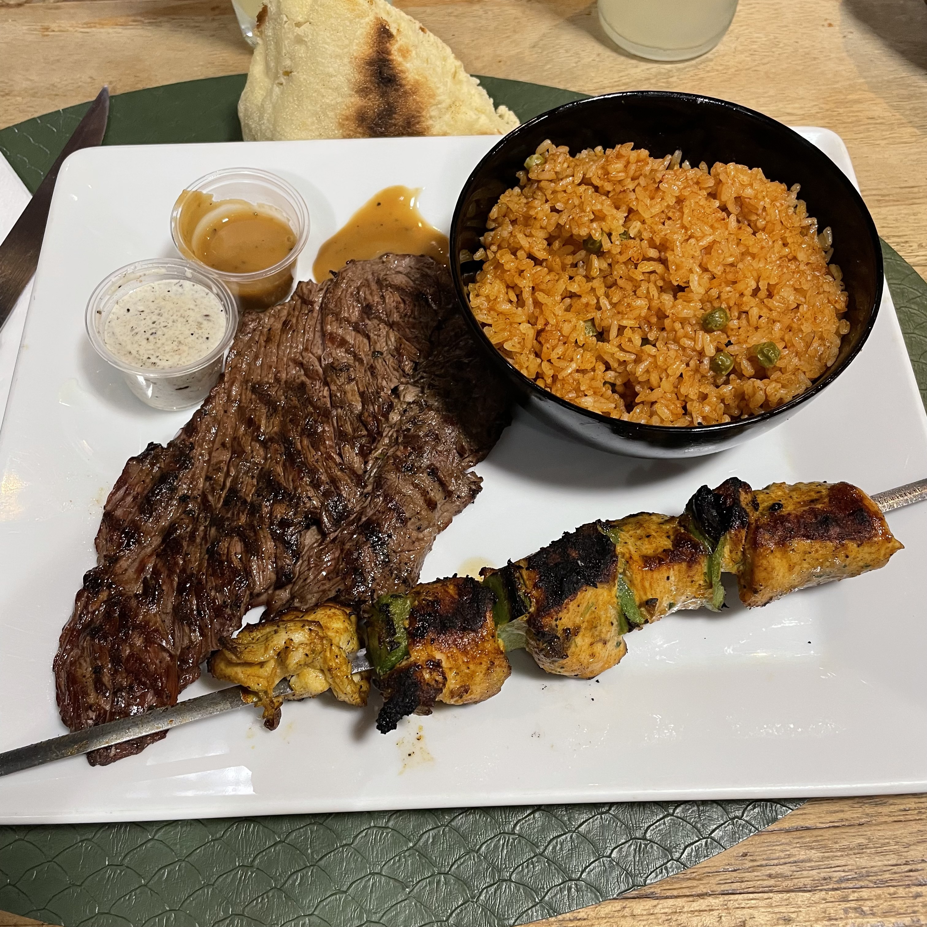 Avis mitigé car brochettes de bœuf difficiles à manger tellement il y avait de nerfs alors que pour les autres personnes la viande était bonne..et un seul dessert possible puisqu'ils étaient en flux tendu alors qu'il y avait à peine 10 personnes dans le restau..😟 et carte des boissons très limitée..