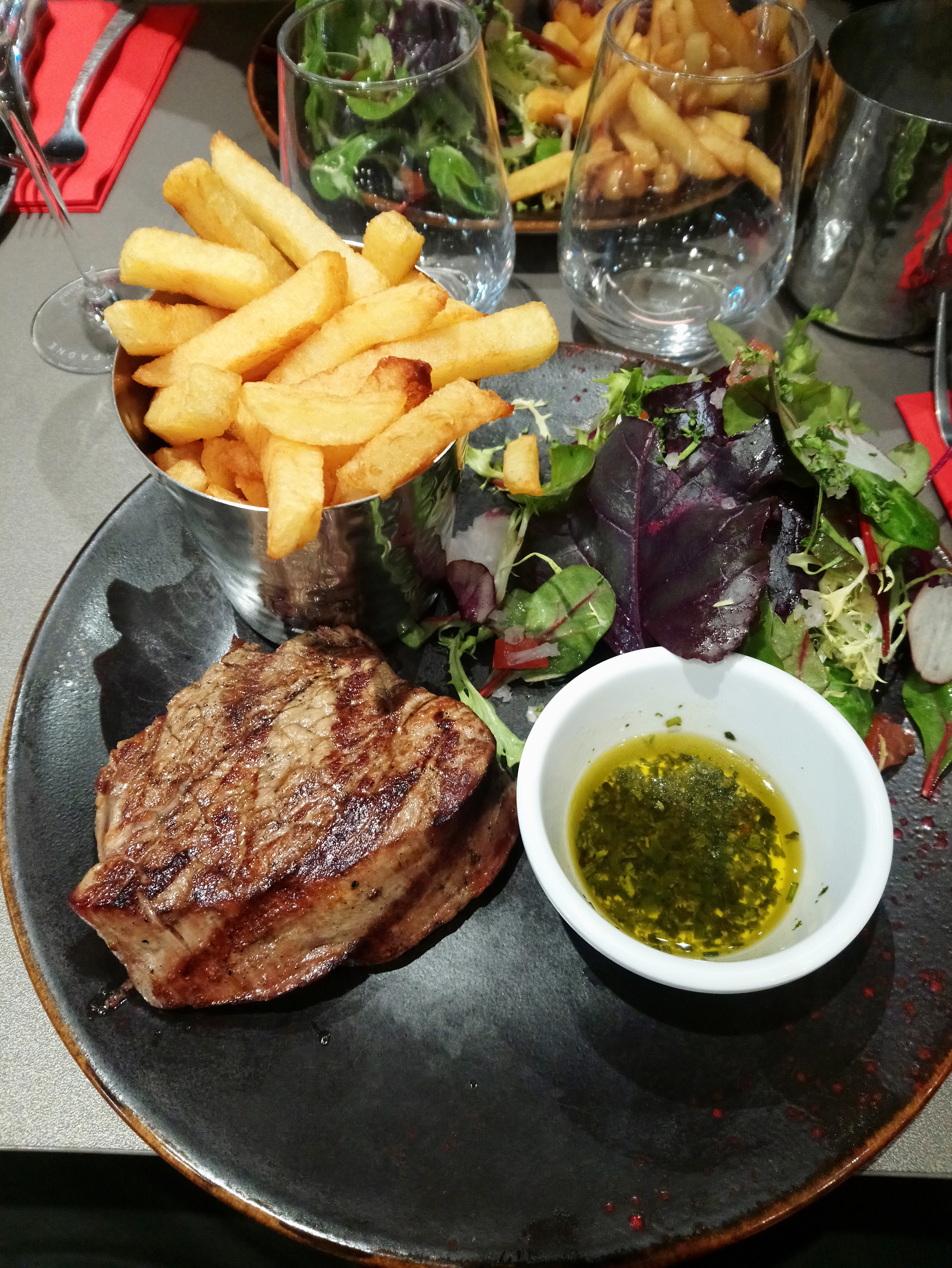 Posté le 21/05/2021 à 11:02"Une très belle expérience...la viande...une jouissance pour les papilles. Un petit effort est à apporter pour les desserts car 4 desserts posés(dont 2 congelés) dans une assiette n'ont jamais fait un café gourmand...Merci à votre adorable serveuse souriante; et un petit bémol pour le serveur masculin qui n'a pas compris que le masque se porte sur le nez et la bouche et que du boeuf de Chateaubriand n'a jamais été une race sauf en humour!😊Mais nous reviendrons juste pour déguster la viande😍"