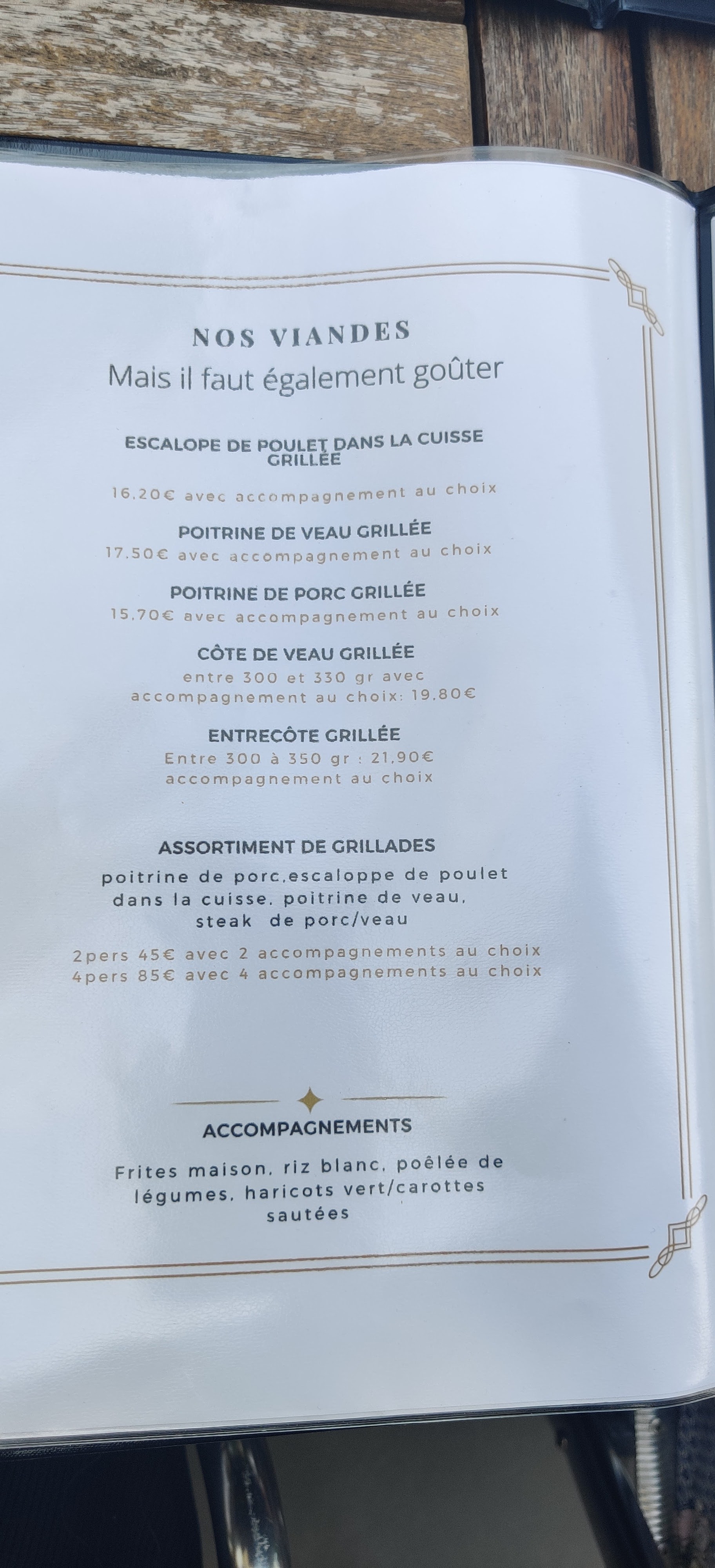 Posté le 30/11/2022 à 21:45"Super accueil comme à la maison, la viande super et les accompagnements qui laisse de la place à la viande, super !!! Le poulet pour les enfants c'est du beurre Les vins bien choisis A recommander"