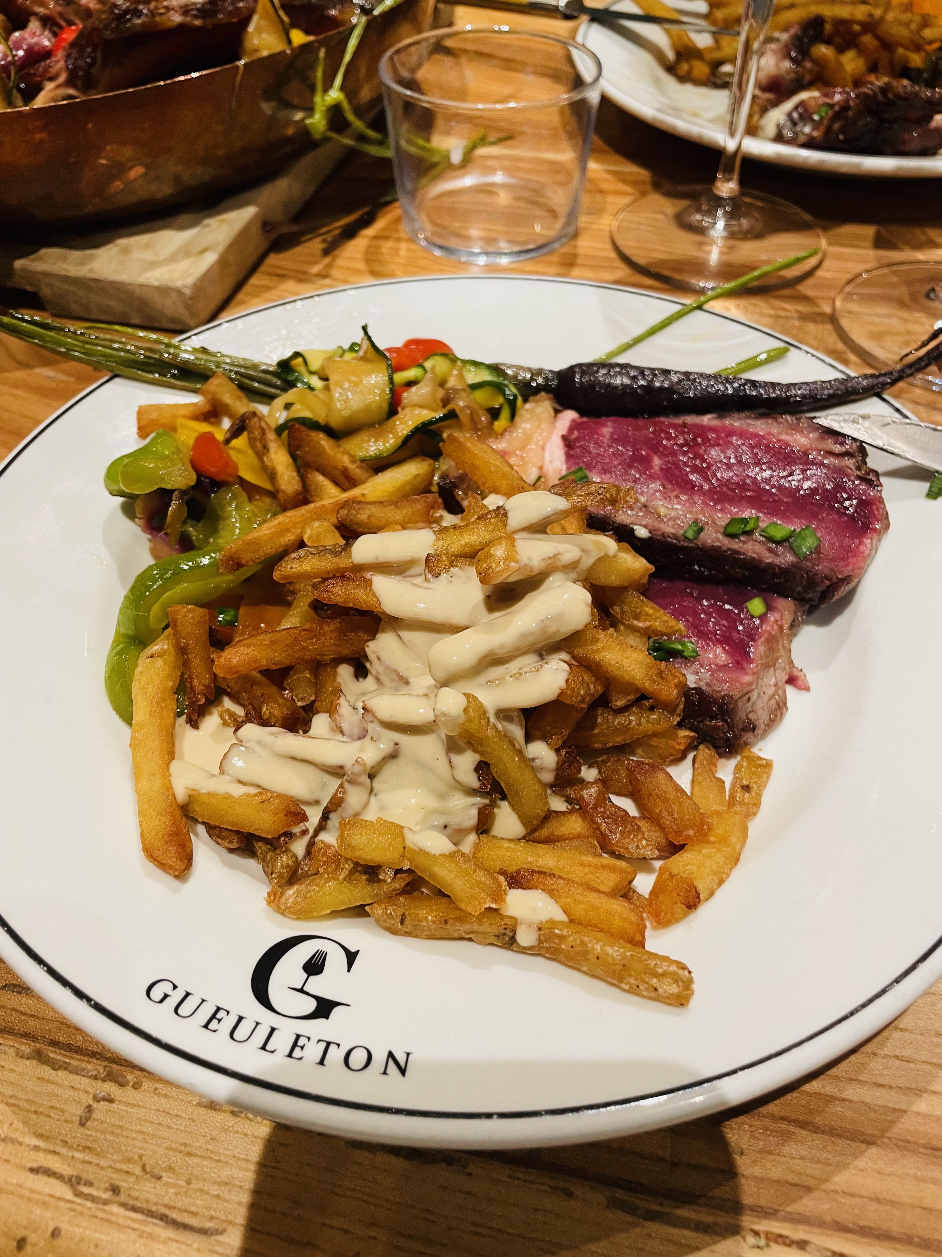 Posté le 01/01/2025 à 15:17"Diner ce soir pour 2. Première bonne première expérience chez Gueuleton, serveur aimable et ambiance vraiment adapté. Pour les plats cela à été un regal sauf un bémol, ayant commandé une viande saignante j'ai eu la malheureuse surprise de la recevoir bleu. Les couteaux ne coupent pas très correctement et c'est dommage. Le personnel dédié au service fût très reactif sur les 2 points cités plus haut. Changement rapide de couvert et le plat reparti en cuisine avec une portion de frites pour patienter. Le prix quant à lui vaut le coup. 170€ (Il faut compter 70€ pour une bouteille de vin que j'ai choisi et dont je n'en regrette rien). Une très bonne expérience que je recommande aux amateurs de viande."