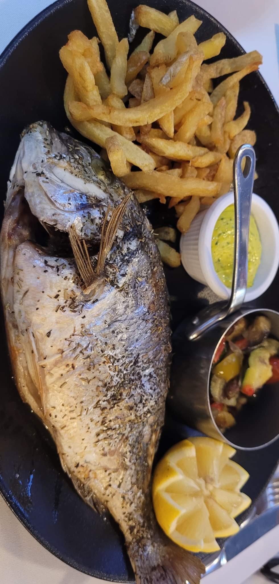 Posté le 10/06/2024 à 21:17" La dorade grillée était correcte, les frites étaient médiocres car tièdes et farineuses, il y avait peu de légumes et un peu trop molles. Nous avions commandé 2 daurades et elles ont été servies avec une rapidité inhabituelle car elles avaient déjà été pré-grillées et gardées seulement au chaud. Ça ne marche pas du tout ! La seule bonne chose : vous êtes bien assis. "
